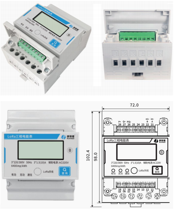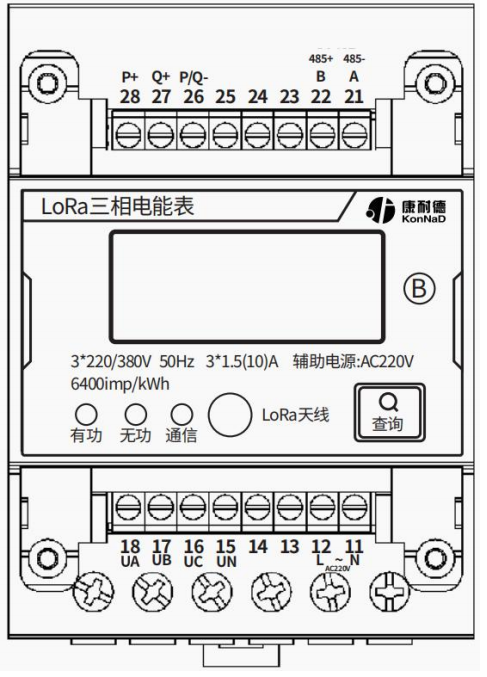 面板下方從左到右分別設有有功脈沖指示燈、無功脈沖指示燈、通信指示燈、LoRa 天線座、查詢按鍵。